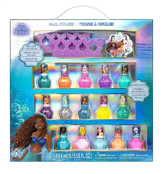 "Esmaltes Ariel: ¡Un set de 18 piezas para brillar como la sirena favorita de Disney! Colores encantadores que te transportarán bajo el mar."