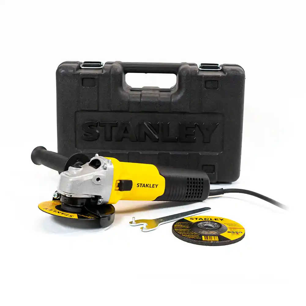 Mini Esmeriladora con potente motor de 1050W + Discos de 4-1/2 pulgadas + estuche Stanley, con campo eléctrico dividido, para uso pesado, engranajes en espiral para menos fricción y más durabilidad, diseño ergonómico, para trabajar con comodidad por más tiempo.