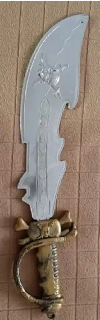 Esta es una espada corta decorativa de plástico, probablemente parte de un disfraz o juguete. Presenta un diseño fantasioso: