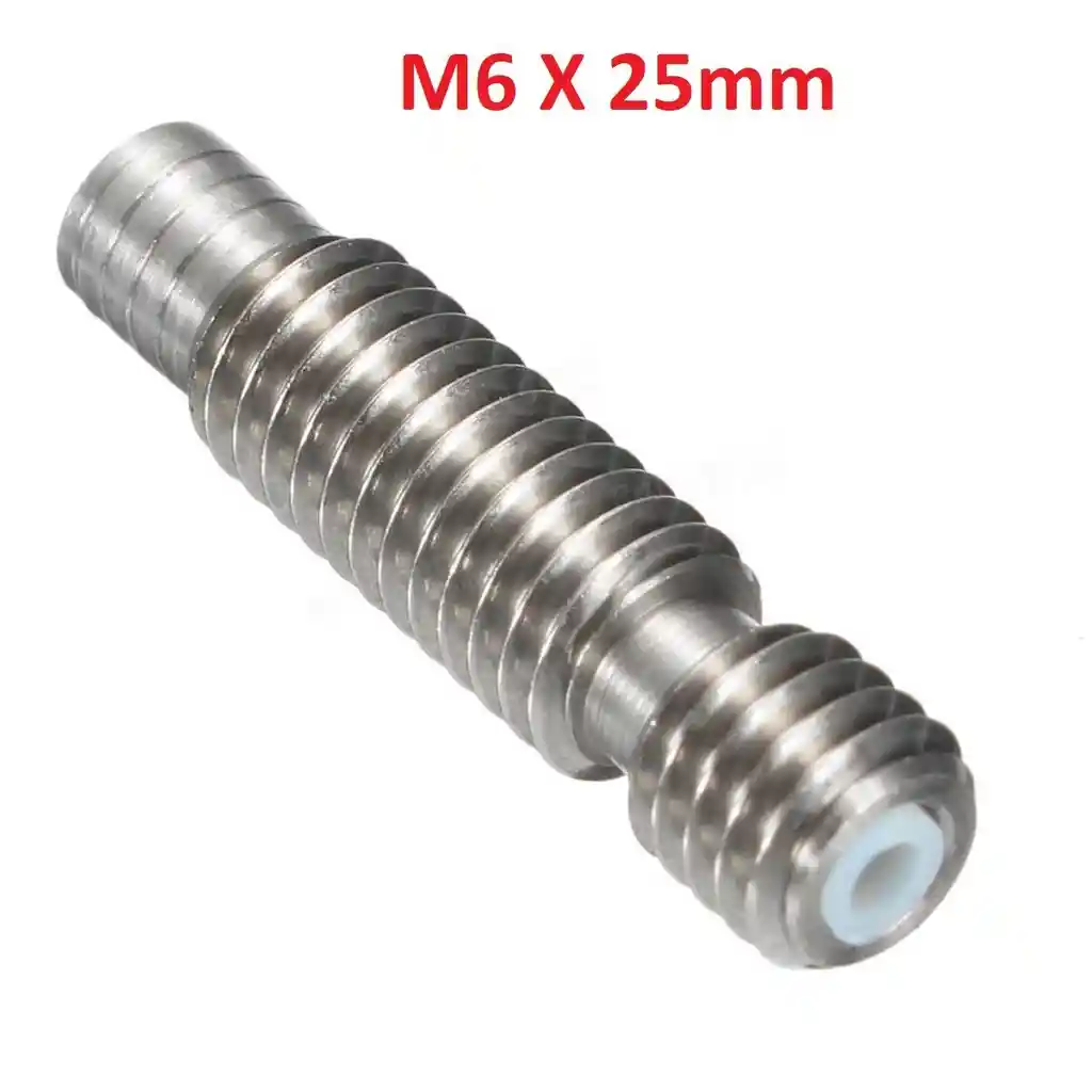 GARGANTILLA CON TEFLON PARA EVITAR QUE SE DERRITA EL FILAMENTO ANTES DE LLEGAR A LA BOQUILLA. TIPO DE ROSCA M6. LONGITUD: 25mm. Para filamento de 1.75mm. CON TEFLON PTFE INTERNO LA COMPRA INCLUYE: 1 x GARGANTA EXTRUSOR HOTEND M6x25mm