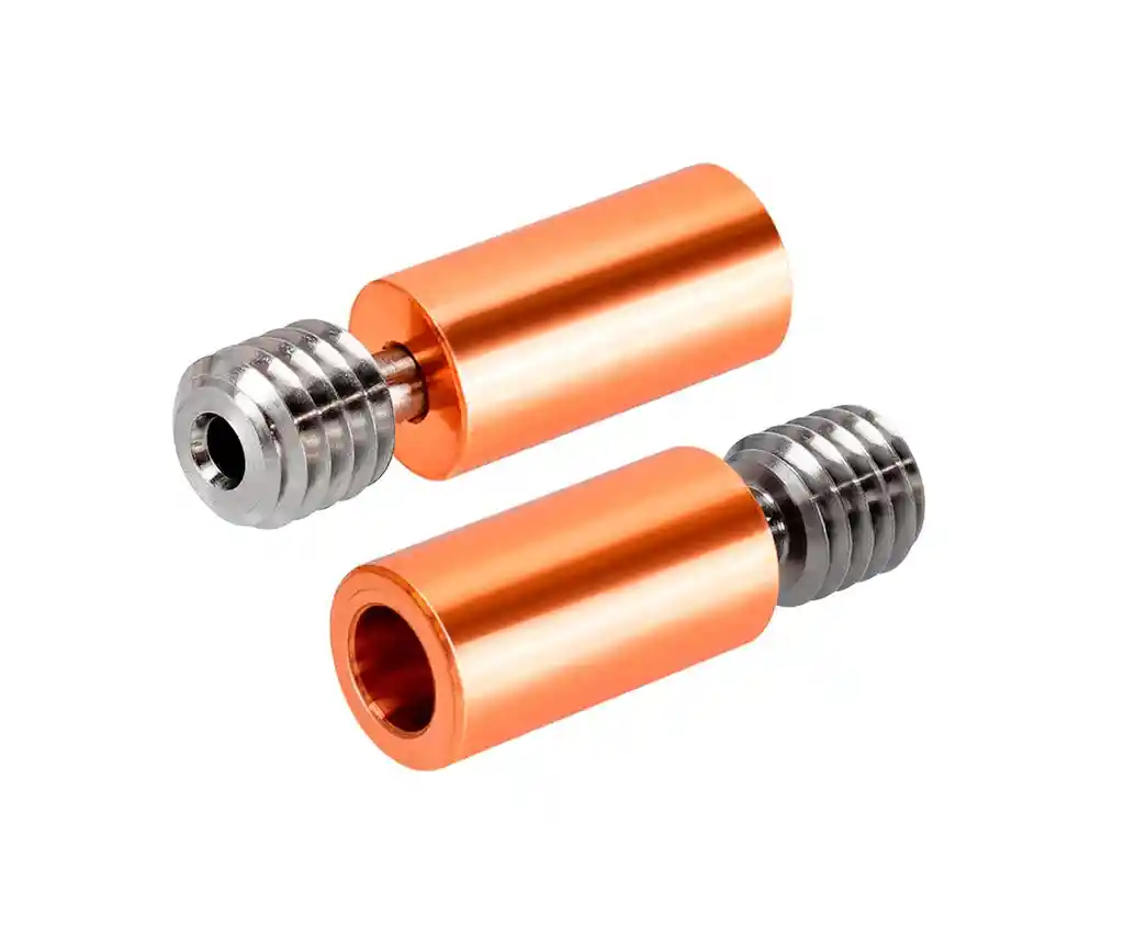 Bimetal aleación de titanio 1.75mm NG: 7g Material: aleación de titanio + cobre Temperatura resistente al calor: 450- 500°C Hilo: M6. Longitud: 21mm Uso para: filamento de 1,75 mm Aplicar para: CR10 Ender3 Reprap LA COMPRA INCLUYE: 1x GARGANTILLA ESPARRAGO ALEACION TITANIO 1,75mm M6 21mm