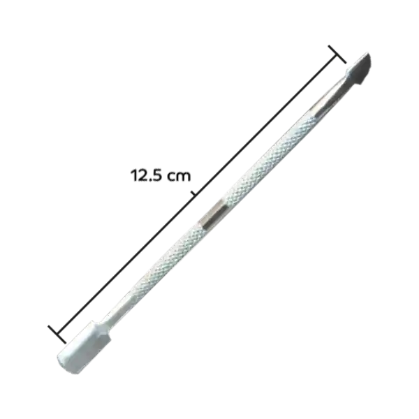 Remueve y empuja las cuticulas en acero inoxidable. Ideal para limpiar debajo de la cuticula o la suciedad de las uñas. Cada punta tiene uso diferente.