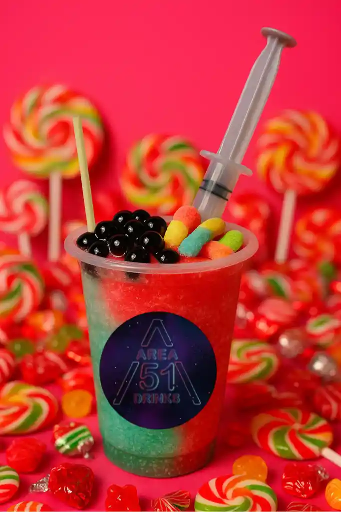 Coctel granizado con una mezcla fuerte de nerds, sabor a Champaña, Vodka, Tequila y Ginebra
