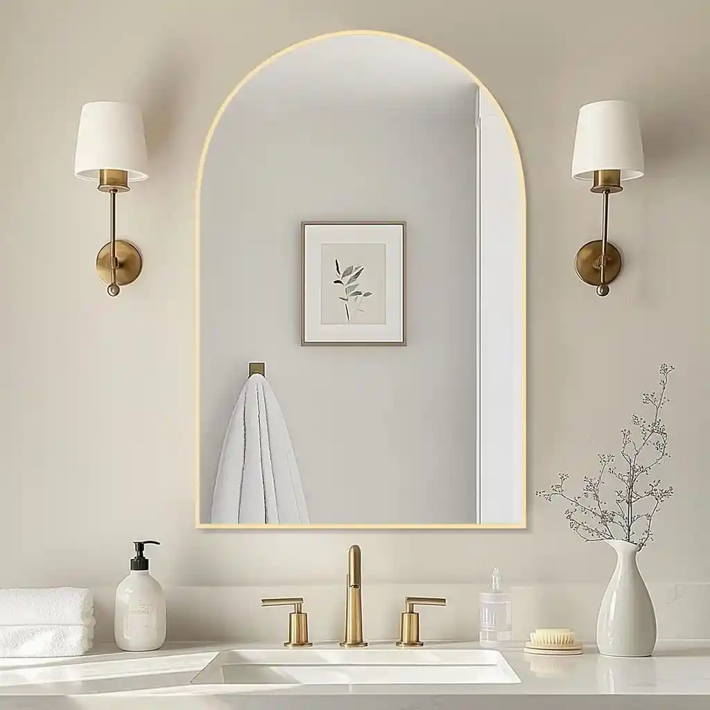 Este espejo de pared con un elegante marco dorado y un diseño arqueado en la parte superior mide 80 cm de altura, ideal para añadir un toque moderno y sofisticado a cualquier habitación. Su marco metálico presenta un acabado liso y minimalista que resalta la claridad del espejo sin distraer de su función principal, proporcionando un aspecto contemporáneo que se integra fácilmente en diversos estilos decorativos. La parte superior arqueada le otorga una forma distintiva que añade suavidad al diseño, mientras que su tamaño es perfecto para colocarlo en la entrada, sala, baño o dormitorio. La estructura resistente asegura una excelente durabilidad, manteniendo el espejo en perfecto estado con el tiempo. Este espejo es una elección ideal para aquellos que buscan una combinación de funcionalidad y diseño elegante para realzar la estética del hogar