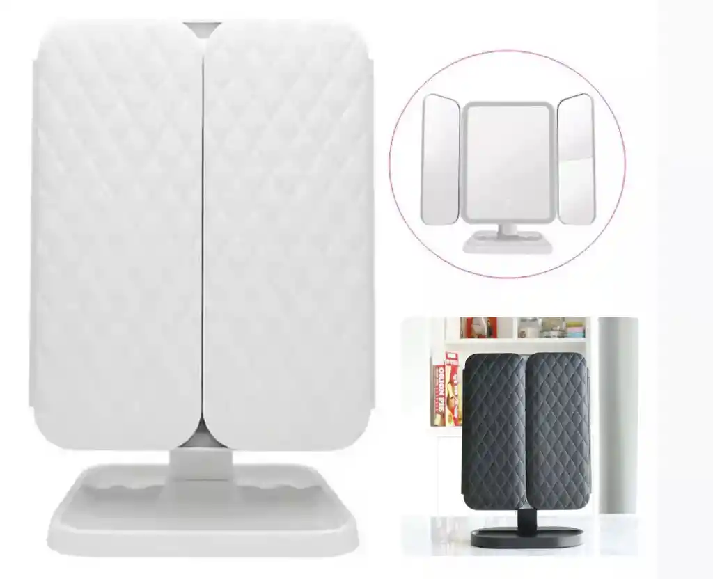 Este Espejo Trípico con Apertura de 2 Laterales es la herramienta perfecta para tu rutina de belleza. Con dos tipos de aumento en uno de sus laterales y un diseño elegante en color blanco, ofrece tres tonalidades de luz (cálida, fría y neutra) para adaptarse a tus necesidades. Su base de apoyo y capacidad para girar 180 grados te permiten ajustarlo a la posición deseada, mientras que su batería recargable por USB garantiza un uso inalámbrico conveniente. . Espejo Trípico: Tres espejos con aumento en un lateral . Luces Regulables: Tres tonalidades de luz (cálida, fría y neutra) con brillo ajustable . Angulo Ajustable: Gira 180 grados para una visión cómoda . Batería Interna Recargable por USB: No necesita pilas, solo recarga mediante cable USB incluido . Uso Inalámbrico: Funciona sin conexión cuando la batería está cargada . Base Porta Objetos: Ideal para organizar tus accesorios de belleza . Táctil (Touch): Control intuitivo para ajustar la luz . Color: Blanco, Negro diseño elegante y moderno