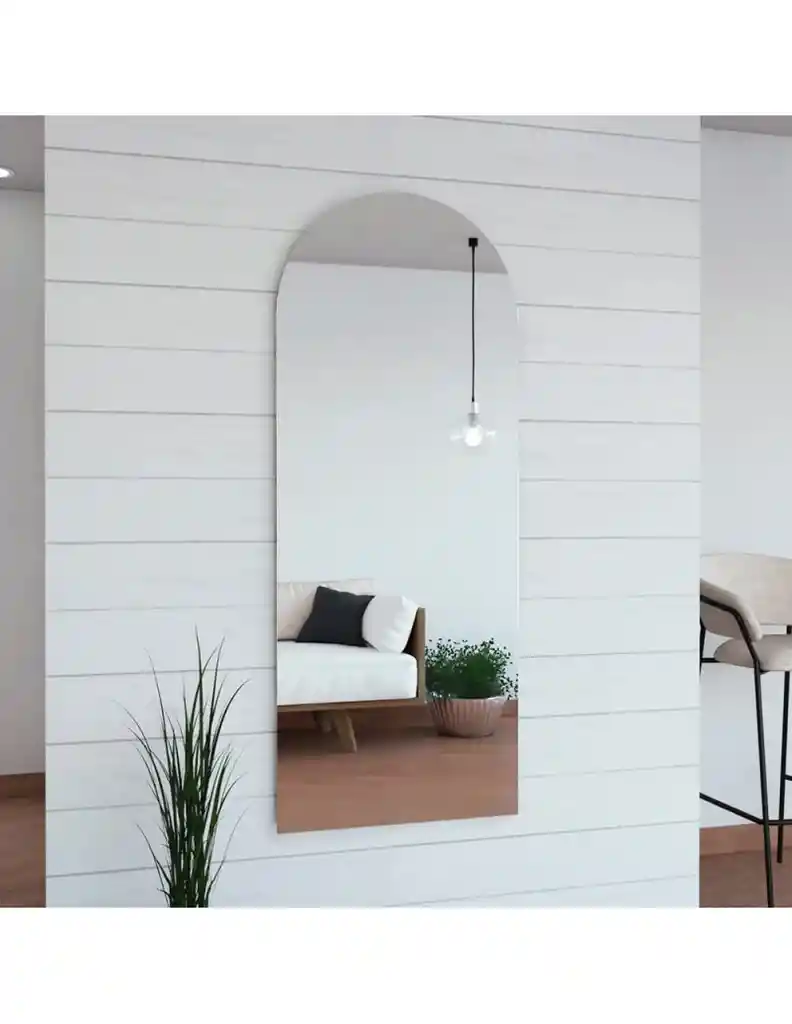 Espejo palma Espejo rectangular con parte superior redondeada. Ensamble fácil a la pared con marco en MDP + chaflán Materiales: Espejo plata, chaflan en mdp. Medidas: 150 alto x 60 ancho x 1,9 espesor.