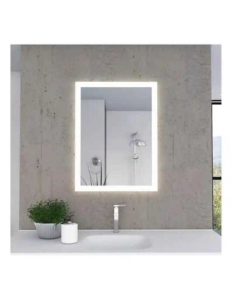 Espejo surrey Espejo rectangular con bordes en sandblasting, luz led y botón touch. Ensamble fácil a la pared con marco en MDP + chaflán Materiales: Espejo plata, cinta luz led, botón touch, chaflan en mdp. Medidas: 80 alto x 60 ancho x 3,4 espesor.
