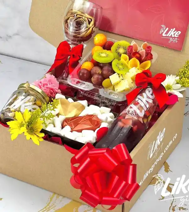En cada instante compartido, el amor se convierte en una melodía que embriaga el alma. Regala esperanza sangría Contenido: 1 Maridaje Elaborado con Queso sabanero, Queso mozzarella Orégano, Salami, Chorizo Vela, Jamón de Cerdo, Aceitunas, Kiwi, Fresas, Uvas, Uchuvas. 1 Sangría 300ml. 1 Caja de Chocolates con un Corazón, una Paleta y Mini masmelos decorativos. 1 Copa con una Rosa por dentro. 1 Frasco de Frutos Secos. 1 Tarjeta personalizada. Decoración con flores de diferente tipos.