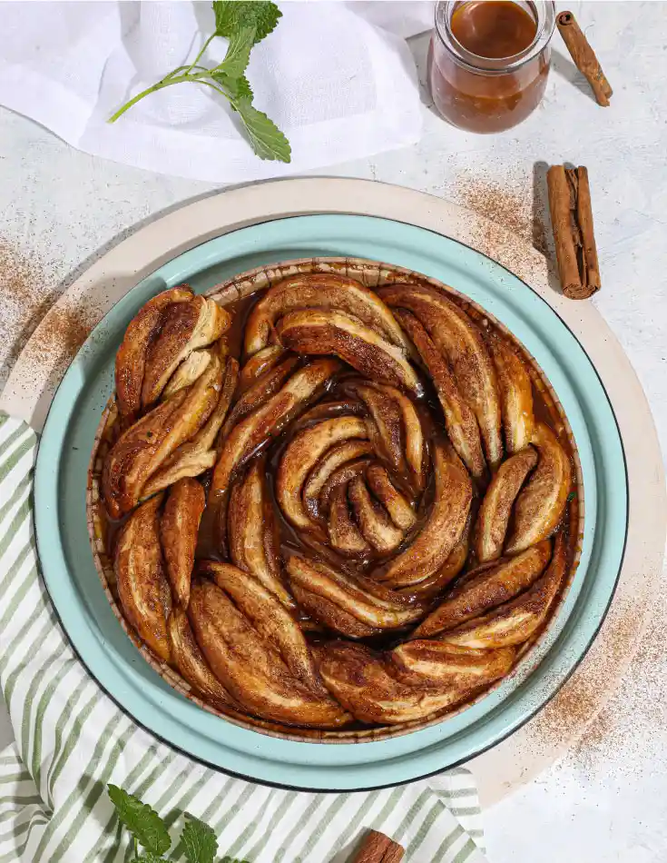 Capas de Canela, Azúcar y Caramelo Salado Envueltos En Masa de Hojaldre Artesanal