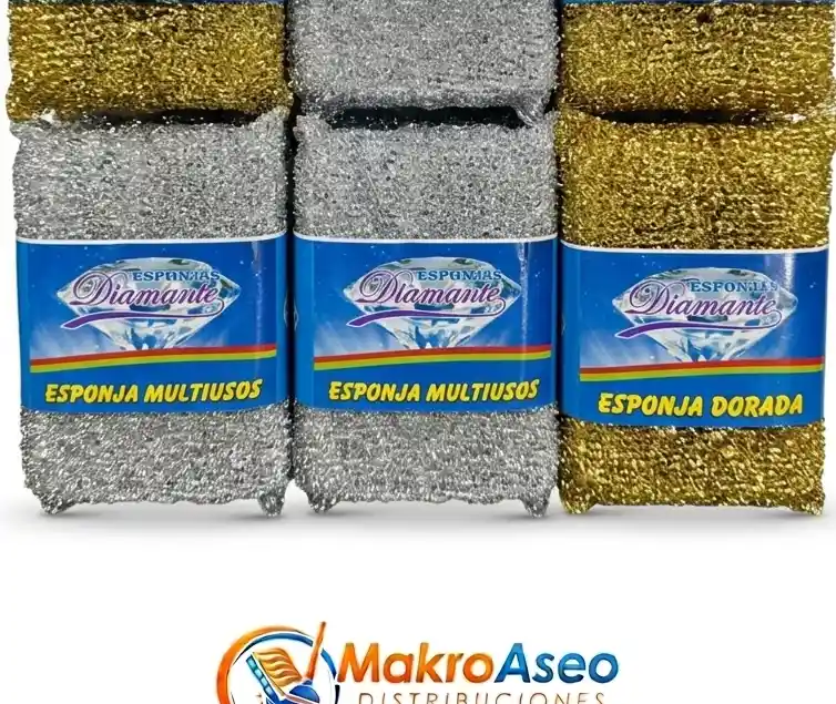 La esponja multiusos oro/plata es ideal para la limpieza de diferentes utensilios de cocina, como ollas y sartenes, superficies de aluminio o acero inoxidable sin rayar o dejar marcas, removiendo la suciedad de manera eficaz. Está fabricada en una base de tejido con hilo de poliéster compactado e hilo de poliéster plano metalizado tipo durex de 1/32 de ancho por 25 micras de espesor en color y con espuma sintética