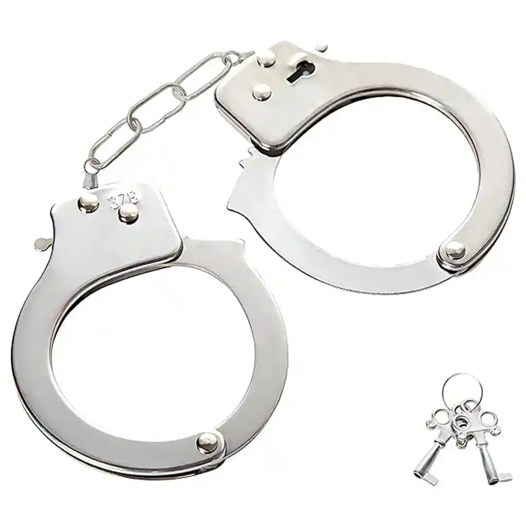 Esposas metálicas en latón, para disfraces, fiestas y juegos, (Halloween) Vienen las esposas y 2 llaves para abrirlas Tiene un sistema de apertura de seguridad en caso de perder las llaves, el cual consta de una palanca pequeña en la base de las esposas, se presiona y se mueve la esposa para salir o sacar de la trabilla