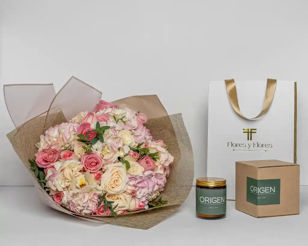 Hermoso bouquet compuesto por rosas, hortensias, clavelinas y eucalipto parvifolia, cuidadosamente seleccionado y dispuesto en una envoltura de papel importado y yute que resalta su estilo natural y sofisticado. Incluye una elegante vela aromática de cera de soja, acompañada de una presentación en bolsa de lujo que completa la experiencia de regalo. Incluye tarjeta con mensaje personalizado y tarjeta de cuidados para preservar la frescura del arreglo floral.