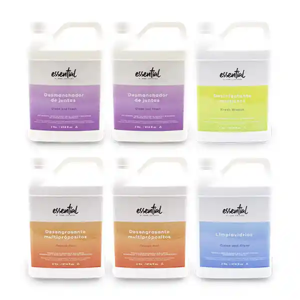 Kit Incluye Essential Desmanchadores de Juntas 2 Unidades de 2 L c/u + Essential Desengrasantes Multipropósitos 2 Unidades de 2 L c/u + Essential Desinfectante Multiusos 2 L + Essential Limpiavidrios Perfectos Para la Limpieza y Desinfección de tu Hogar en Este Año Nuevo 2 L