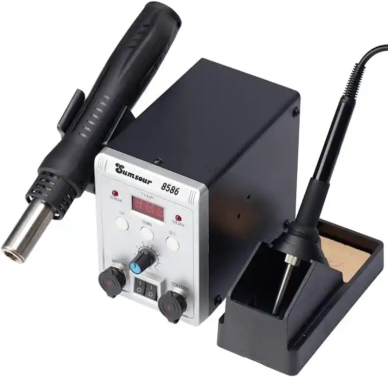 Estación de soldadura de retrabajo SMD pantalla Digital LED pistola de aire caliente soldador 110V enchufe estadounidense herramientas de reparación de soldadura ESD El mango con interruptor de sensor cuenta con modo de funcionamiento de acceso cuando se levanta o modo de espera cuando se acuesta; Función de enfriamiento automático para prolongar efectivamente la vida útil del calentador y proteger la pistola de aire caliente; Diseño ESD de soldador para proteger componentes sensibles; Calentador estándar internacional para uso e intercambio convenientes; Resistencia de alta calidad para un uso duradero; Soporte de plástico para colocar la pistola de aire caliente; Soporte metálico para mantener la plancha alejada de materiales inflamables; Se adapta para termocontracción, secado, eliminación de laca, eliminación de viscosidad, descongelación, precalentamiento y soldadura con pegamento; Voltaje: 110V Dimensión: 4" x 5,2" x 6"(10 x 13,2 x 15 cm) Especificación de retrabajo: Potencia: 700w Resistente : <2 OHM Tamaño de la pieza de mano: <23 mm Estabilidad de temperatura: ± 1'C Ventilador: bola sin escobillas Flujo de aire: 120 l/min (máx.) Ruido: <45dB Control de temperatura: 100 ~ 480 ºC. Especificación de soldadura: Potencia : 50W Resistente : <2 OHM Estabilidad de temperatura: ± 1'C Hierro: diseño ESD Material del calentador: Nicromo Control de temperatura: 200 ~ 480 ºC. LA COMPRA INCLUYE: 1X ESTACION CALOR SOLDADURA 8586 110V