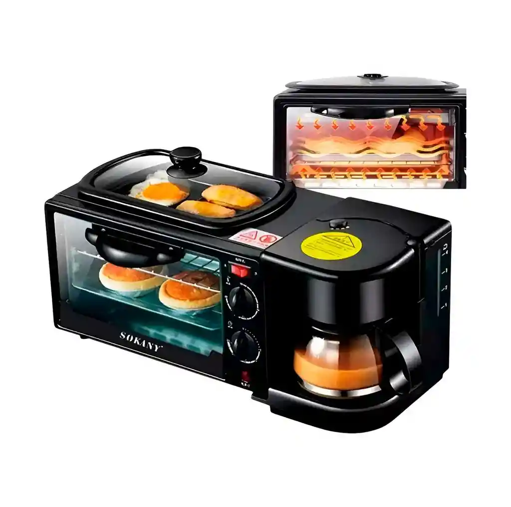Esta estación de desayuno 3 en 1 es la solución integral y compacta diseñada para optimizar tus mañanas, permitiéndote preparar café, tostadas y alimentos fritos de manera simultánea en un solo dispositivo. Equipada con un horno tostador de 9 litros con temporizador ajustable, una cafetera con jarra de vidrio antigoteo y una plancha superior con tapa de cristal para freír huevos o carnes, esta máquina maximiza la eficiencia energética y el espacio en tu cocina. Su construcción robusta con acabados de alta calidad y controles independientes garantiza un manejo sencillo y seguro, convirtiéndola en el electrodoméstico ideal para hogares modernos, oficinas o apartaestudios que buscan practicidad y un desayuno completo en cuestión de minutos. FICHA TÉCNICA Producto: Máquina Fabricante de Desayuno Multifuncional 3 en 1 Funciones: Horno Tostador, Cafetera y Plancha Superior Capacidad del Horno: 9 Litros Capacidad de la Cafetera: 4 a 6 tazas aproximadamente Potencia Total: 1050W - 1250W Voltaje: 110V - 120V (Uso doméstico estándar) Temporizador: Ajustable hasta 30 minutos con campana de aviso Control de Temperatura: Ajustable según la preparación Materiales: Acero inoxidable, vidrio templado y componentes termo-resistentes Dimensiones del Producto: 46.7 cm (Largo) x 28 cm (Ancho) x 21 cm (Alto) Garantía: 1 mes por defectos de fábrica POLÍTICA DE GARANTÍA Y RETRACTO Este electrodoméstico cuenta con 1 mes de garantía por defectos de fábrica; por favor revise el producto al recibirlo, ya que no aplica retracto ni garantía tras su uso. Dispone de máximo 5 días para reportar novedades (piezas faltantes o daños de transporte) y, para cualquier devolución, es indispensable entregar el producto en su empaque original en buen estado, con todas sus partes y documentos completos.