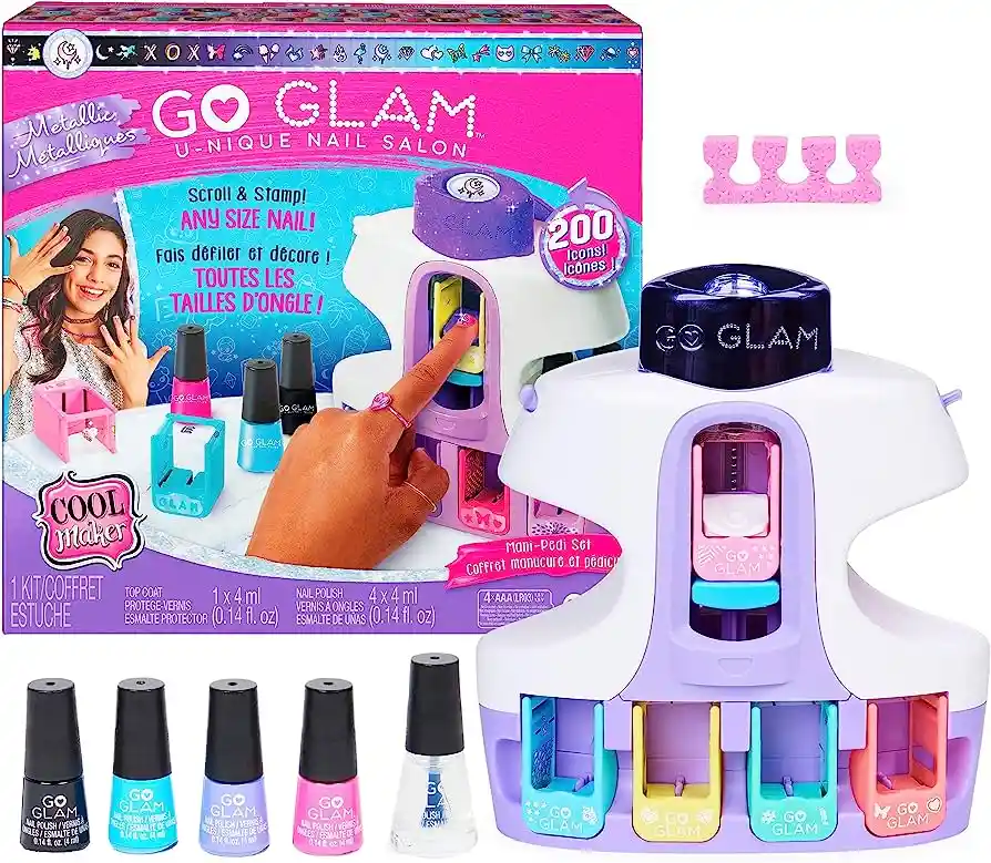 Kit exclusivo de uñas todo en uno: Este producto profesional tiene 5 cápsulas de diseño, incluyendo 4 metálicos exclusivos; 4 colores de esmalte de uñas, una secadora, almacenamiento y sello extraíble Sello y desplazamiento personalizado para manicura y-pedicura 200 diseños únicos: Elige entre 200 iconos para la personalización definitiva Mezcla y combina las cápsulas del kit de arte de uñas y estampa diseños clásicos o letras metálicas, patrones, gemas e iconos exclusivos Sello de uñas portátil: El sello extraíble de GO GLAM U-nique Metallic Nail Salon hace que sea fácil sellar tus dedos de los pies y arte de uñas dondequiera que vayas Coloca un soporte de diseño, gira el dial y presiona para sellar Estilo hasta 360 uñas: Diseña hasta 360 uñas de cualquier tamaño con los diseños y 4 colores de esmalte de uñas GO GLAM no tóxico, incluyendo esmalte negro que no encontrarás en ningún otro lugar Estampa mensajes personalizados con letras.