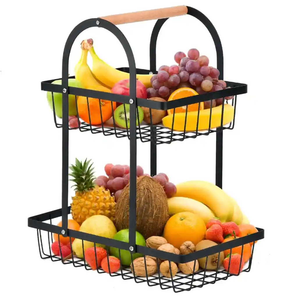 Organizador Metálico de 2 Pisos para Cocina o Comedor El organizador metálico de dos pisos es la opción ideal para mantener el orden sin perder elegancia. Diseñado para optimizar el espacio, ofrece almacenamiento adicional para frutas, verduras, pan o pequeños accesorios de cocina. Su diseño ventilado garantiza la frescura de los alimentos, mientras que su base elevada evita el contacto directo con superficies húmedas. Fabricado con acero resistente y pintura en polvo negra, su estructura es firme, duradera y fácil de limpiar. Su montaje se realiza en pocos minutos y su diseño ligero permite transportarlo con facilidad. Es también una excelente opción decorativa para comedores, oficinas o tiendas. Especificaciones: Material: Acero con recubrimiento en polvo + mango de madera Color: Negro Tamaño: 29 cm de alto aprox. Capacidad: Ideal para frutas, verduras, pan o snacks Diseño: Abierto, resistente, moderno y funcional Ensamble rápido y sin herramientas complejas Nota: Producto con garantía de 30 días por defectos de fábrica.
