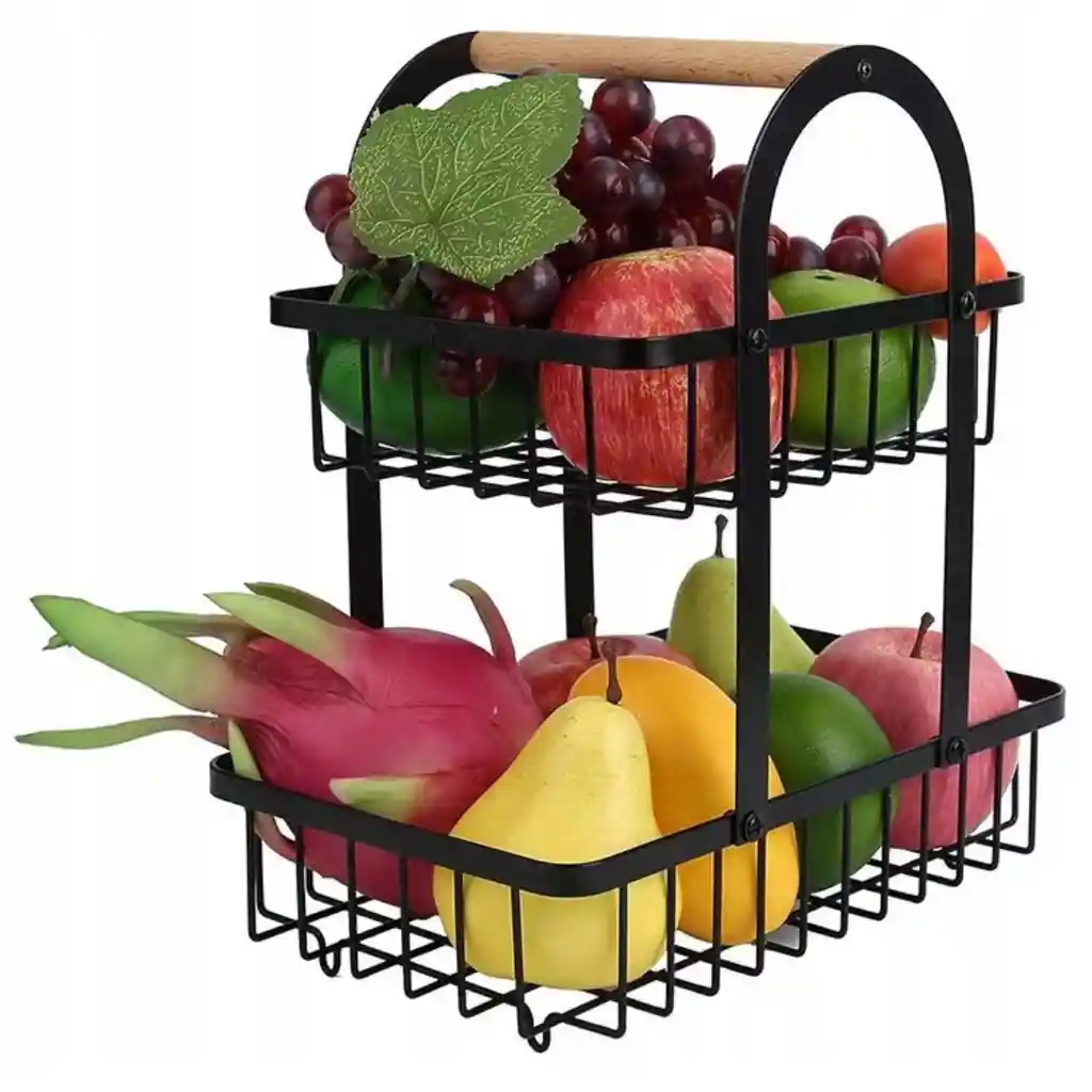 Estante Decorativo Doble para Frutas, Verduras o Pan Dale estilo y orden a tu cocina con este estante decorativo de dos niveles. Su diseño compacto y resistente está pensado para organizar alimentos o artículos diversos sin perder elegancia. Con cestas de diferentes tamaños, ofrece una distribución visual agradable y práctica. La estructura metálica con recubrimiento antioxidante proporciona durabilidad y estabilidad, mientras que el mango de madera natural permite un agarre cómodo y seguro. Perfecto para colocar en encimeras, comedores o mesas, este frutero no solo cumple una función práctica, sino también decorativa. Su diseño ventilado evita la acumulación de humedad, manteniendo la frescura de los alimentos por más tiempo. Especificaciones: Material: Acero + madera natural Niveles: 2 (superior 21x18 cm / inferior 27x18 cm) Altura total: 29 cm Color: Negro con detalles en madera Función: Organizador para frutas, verduras o artículos decorativos Fácil de montar y limpiar Nota: Este producto incluye garantía de 30 días por defectos de fabricación.