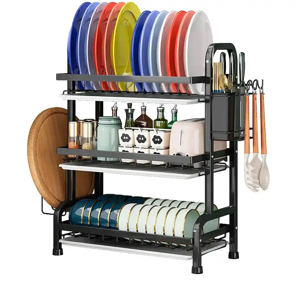 Organiza y optimiza el espacio de tu cocina con este escurridor de platos de tres niveles, diseñado para mantener platos, tazones, vasos y cubiertos perfectamente ordenados. Incluye compartimentos especiales para tabla de cortar, cuchillos y palillos, así como bandejas de drenaje extraíbles que facilitan la recolección y vaciado del agua, manteniendo la encimera siempre seca y limpia. Fabricado en acero al carbono engrosado, ofrece una gran resistencia, capacidad de carga y durabilidad, mientras que sus patas antideslizantes aportan estabilidad y protegen la superficie de rayones. Su espaciamiento entre niveles está pensado para adaptarse a diferentes tamaños de utensilios, permitiendo un secado más eficiente y ordenado en cada uso. Ficha Técnica: Dimensiones: 61 cm x 42 cm x 23.5 cm Material:acero al carbono engrosado Uso: Cocina Términos de garantía: Para defectos de fábrica o retractos: Por favor revise el producto apenas lo reciba y antes de usarlo. No aplican ley de retracto o defectos de fábrica luego de usar el producto. Se manejan máximo 5 días para reportar defectos de fábrica (por ejemplo, producto funciona mal, piezas faltantes, rotas, etc). Para hacer efectiva la devolución el producto debe devolverse con el empaque original, el cual debe estar en buen estado, incluir todos los documentos y las partes completas y sin daños.