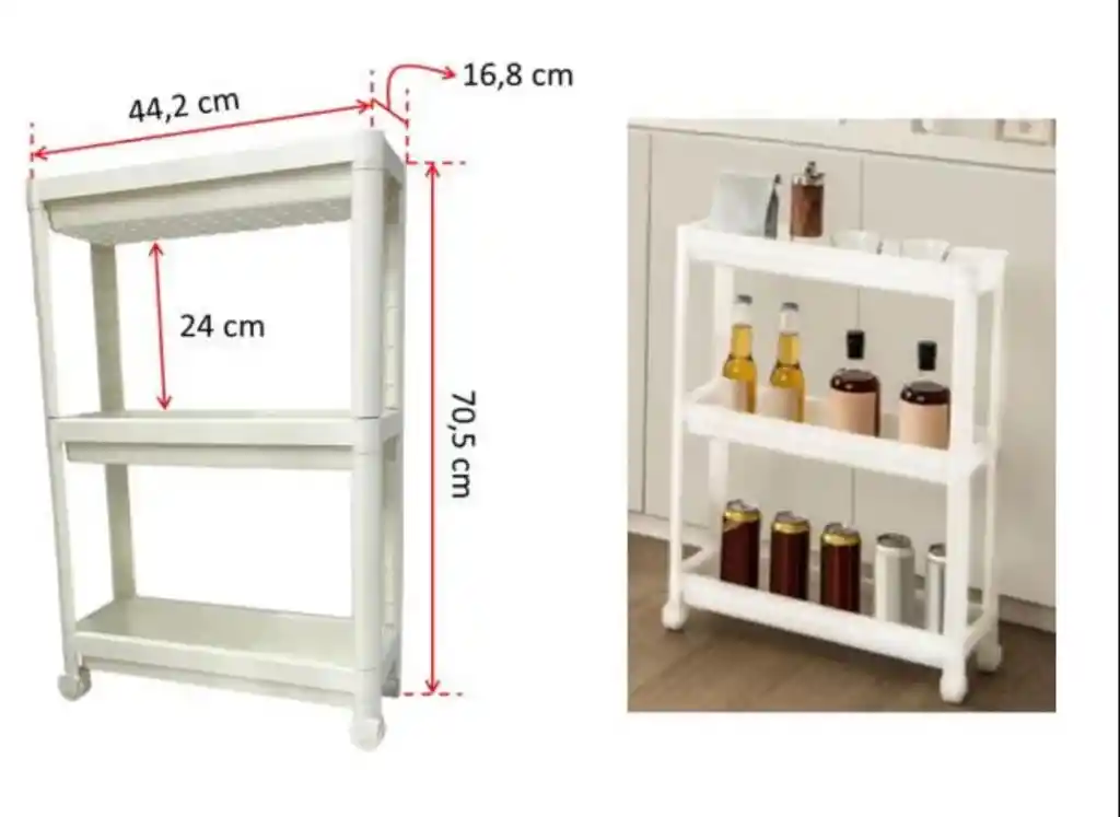 ESTANTE ALMACENAMIENTO -Posee 3 niveles de almacenamiento. -Ideal para organizar elementos para el baño, papeleria, articulos de tocador, frutas, entre otros. -Las ruedas del estante se pueden girar 360o lo cual garantiza que puedas llevarlo a todas partes. -Color: Blanco. EMPAQUE EN PLASTICO