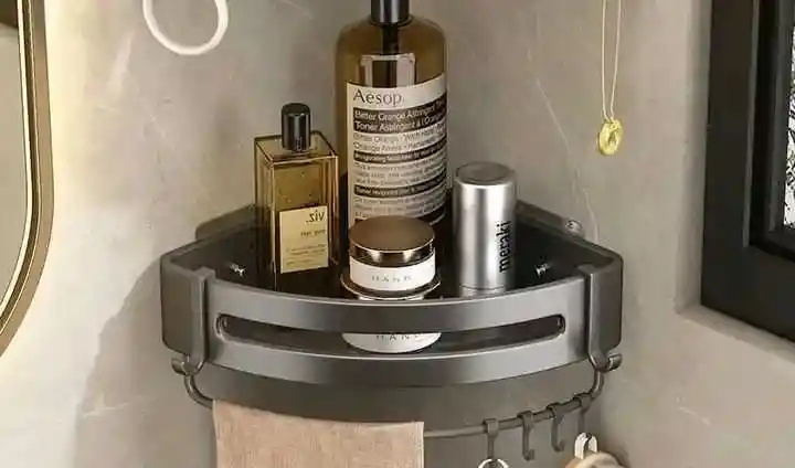 Estante de esquina triangular de plástico - Organizador de pared para baño para jabón, champú, acondicionador - Jabonera de ducha antideslizante con ganchos para colgar accesorios - Solución de almacenamiento para baño, 1 pieza