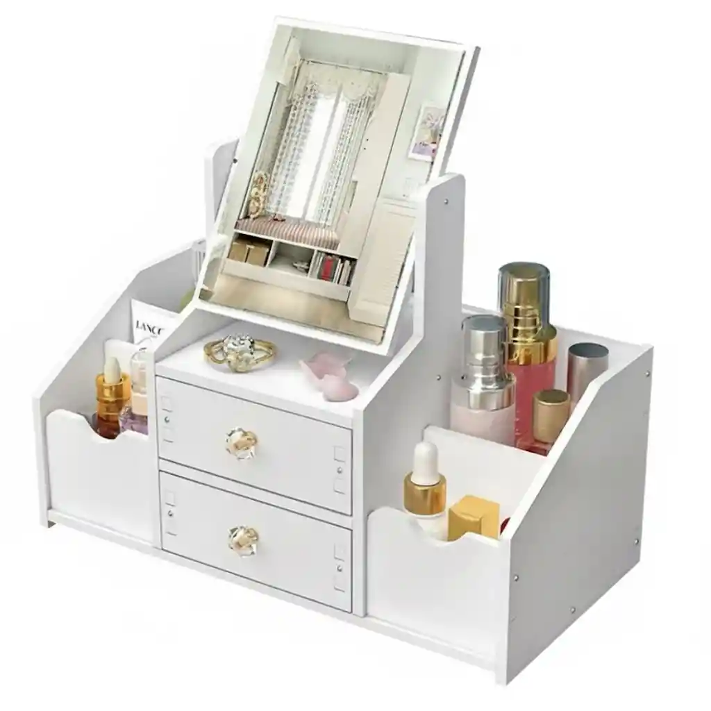 Estante Organizador de Maquillaje con Espejo Diseñado para brindar orden, practicidad y estilo, este estante organizador con espejo es ideal para tocadores, escritorios y mesas de maquillaje. Su estructura funcional permite organizar cosméticos, accesorios y artículos personales en un solo lugar, manteniendo todo al alcance y perfectamente organizado. Fabricado en madera resistente, combina estabilidad, durabilidad y una estética limpia que se adapta fácilmente a cualquier espacio. Especificaciones y Características: Tipo de producto: Estante organizador de maquillaje con espejo Material: Madera Diseño: Multifuncional, compacto y estable Estilo: Moderno y práctico Uso recomendado: Maquillaje, cuidado personal, tocador, escritorio Distribución Funcional: Espejo integrado: Ideal para maquillaje, peinado y cuidado facial Compartimentos organizadores: Para cosméticos, perfumes, brochas, cremas y accesorios Estructura estable: Permite mantener todos los productos visibles y ordenados Dimensiones Totales (Aprox.): Alto: 41 cm Ancho: 20 cm Largo: 37 cm Dimensiones del Espejo: Alto: 21 cm Ancho: 16 cm Contenido del Paquete (Lista de Embalaje): Cantidad: 1 pieza Incluye: Estante organizador con espejo integrado Beneficios del Producto: Optimiza el espacio del tocador Facilita la rutina diaria de maquillaje Mantiene los cosméticos protegidos y organizados Diseño elegante y funcional Garantía Este producto cuenta con 30 días de garantía por defectos de fabricación. Política de Retracto Aplica derecho de retracto dentro de los 5 días hábiles posteriores a la entrega. El producto debe devolverse sin uso, en perfecto estado y con su empaque original intacto. Nota Importante Para aplicar garantía o retracto se deben enviar fotos y/o videos que evidencien claramente el estado del producto. La garantía no cubre daños por golpes, humedad, mal uso o manipulación indebida.