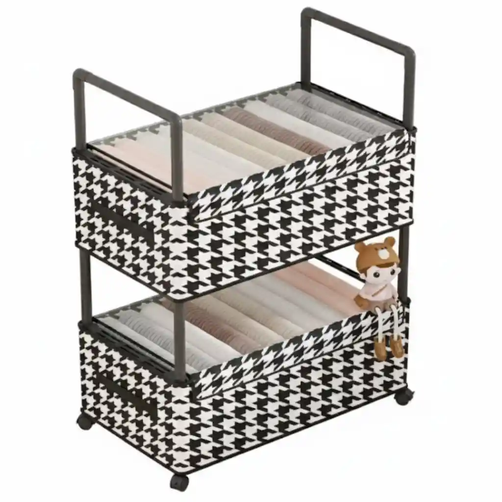 Estante Para Ropa 2 Niveles – Organizador de Tela con Ruedas Este organizador de almacenamiento tipo carrito de dos niveles está diseñado para mantener tu ropa, textiles o artículos del hogar organizados de manera práctica y elegante. Su estilo moderno con patrón decorativo clásico permite integrarlo fácilmente en cualquier espacio, desde dormitorios y vestidores hasta lavanderías o habitaciones infantiles. Especificaciones Técnicas Número de niveles: 2 Material del armazón: Tubos rígidos de metal o plástico resistente Material de las cestas: Tela reforzada con diseño pata de gallo blanco y negro Movilidad: 4 ruedas giratorias para fácil desplazamiento Color: Gris oscuro / Negro con cestas estampadas Estilo: Moderno y minimalista Dimensiones Altura Total: 88.5 cm (incluyendo asas y ruedas) Largo: 57 cm Ancho / Profundidad: 29 cm Características Destacadas Estructura resistente: Armazón tubular que soporta el peso de ropa, toallas o artículos del hogar. Cestas profundas: Permiten almacenar prendas enrolladas, ropa doblada o accesorios, con fácil visibilidad del contenido. Movilidad práctica: Ruedas giratorias que facilitan trasladar el organizador entre habitaciones. Diseño decorativo: Patrón pata de gallo elegante que aporta estilo al espacio. Uso versátil: Ideal para dormitorios, vestidores, lavanderías o habitaciones infantiles. Contenido del Paquete 1 Estante para ropa de 2 niveles con ruedas 2 Cestas textiles con patrón decorativo Armazón tubular con asas y ruedas Uso Recomendado Organización de ropa y textiles Guardado de toallas o accesorios del hogar Complemento práctico en habitaciones infantiles Fácil desplazamiento y acceso a prendas Garantía y Derecho de Retracto Garantía: 30 días por defectos de fabricación. Derecho de retracto: 5 días hábiles desde la entrega. El producto debe devolverse sin uso, en perfecto estado y con su empaque original intacto. Nota Importante Para aplicar garantía o retracto se deben enviar fotos y/o videos que evidencien claramente el estado del producto. La garantía no cubre daños por golpes, humedad, mal uso o manipulación indebida.