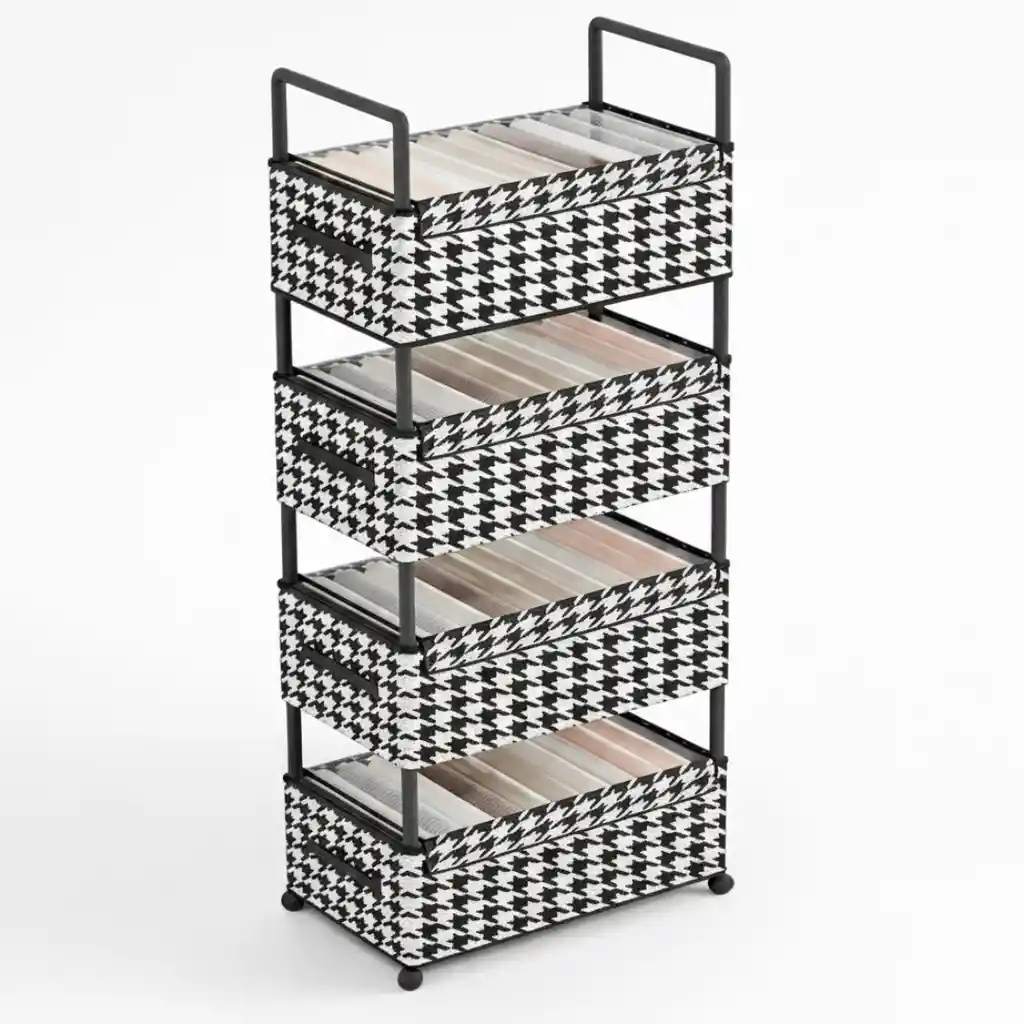 Estante Para Ropa 4 Niveles con Ruedas – Organizador Vertical Decorativo Este estante organizador de 4 niveles está diseñado para el almacenamiento eficiente de ropa, toallas y accesorios del hogar. Su estructura vertical aprovecha al máximo el espacio disponible, mientras su diseño moderno con patrón clásico tipo pata de gallo en blanco y negro aporta un toque elegante y decorativo. Especificaciones del Producto Tipo: Estante organizador vertical Niveles: 4 Material de estructura: Metálico o plástico rígido de alta resistencia Material de los contenedores: Tela reforzada Color estructura: Gris oscuro / Negro Estilo: Moderno con diseño decorativo clásico Movilidad: Ruedas inferiores y asas superiores para fácil transporte Uso recomendado: Dormitorio, vestidor, baño, lavandería u organización general del hogar Dimensiones Altura: 177 cm Ancho: 57 cm Profundidad: 28.5 cm Características Principales Estructura de 4 niveles: Cuatro cajones o bandejas profundas que ofrecen amplia capacidad de almacenamiento. Organización interna eficiente: Cada nivel cuenta con divisores internos que permiten organizar camisetas, pantalones, toallas u otros textiles de forma vertical y ordenada. Diseño decorativo funcional: Estampado clásico tipo pata de gallo. Asas superiores redondeadas para un traslado cómodo. Diseño abierto que permite ver y acceder fácilmente al contenido. Portabilidad mejorada: Base equipada con ruedas pequeñas o patas niveladoras que facilitan el movimiento y estabilidad del organizador. Optimización del espacio: Su formato alto y estrecho lo hace ideal para ambientes con espacio reducido. Contenido del Paquete 1 Estante organizador de 4 niveles 4 cestas textiles con divisores internos 4 ruedas / soportes de base Estructura metálica de soporte Garantía y Derecho de Retracto Garantía: 30 días por defectos de fabricación. Derecho de retracto: 5 días hábiles desde la entrega del producto. El producto debe devolverse sin uso, en perfecto estado y con su empaque original. Condiciones Para aplicar garantía o retracto se deben enviar fotos y/o videos como evidencia. No cubre daños por golpes, humedad, mal uso o manipulación indebida.