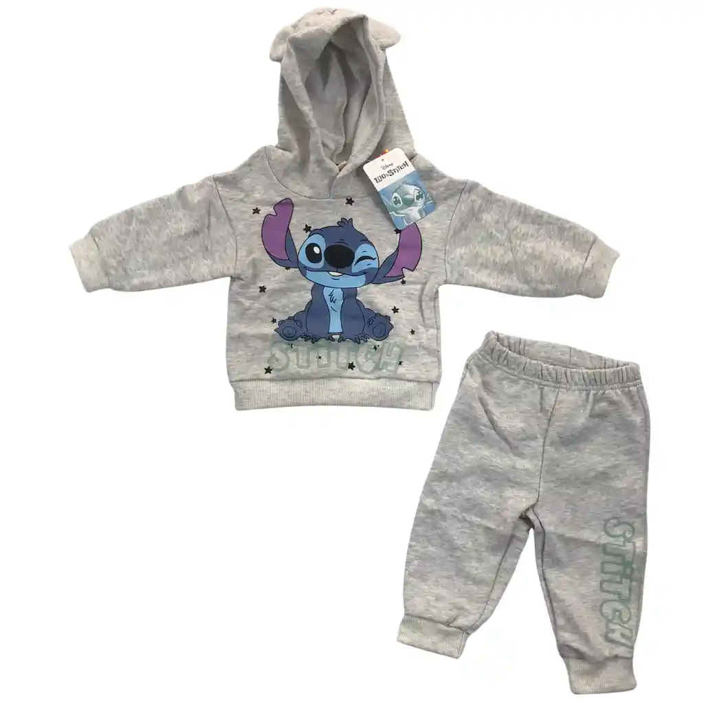 Conjunto deportivo marca Disney ideal para bebés de 2 a 3 años, confeccionado en tela suave y abrigadora perfecta para climas frescos. Este producto incluye: Buso manga larga color gris jaspe con capota y estampado frontal de Stitch Pantalón color gris jaspe con cintura resortada y detalle estampado de Stitch en la pierna Diseñado para brindar comodidad, libertad de movimiento y un estilo tierno con uno de los personajes más queridos de Disney. Perfecto para uso diario o salidas casuales.