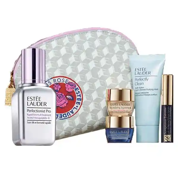 Kit Estée Lauder Incluye 6 Unidades: Tratamiento Facial Perfectionist Pro Rapid Firm Lift 75 mL + Crema Facial Hidratante Revitalizing Supreme Global Anti-Aging Cell Power Creme 7 mL + Crema Facial Para la Noche Revitalizing Supreme Night Intensive Restorative Crème 7 mL + Limpiador Perfectly Clean 30 mL + Pestañina Sumptuous Extreme Negra 2.8 mL + Cosmetiquera Pequeña de Lujo 1 Und. Aclara Manchas Oscuras Con Este Set de Estée Lauder.