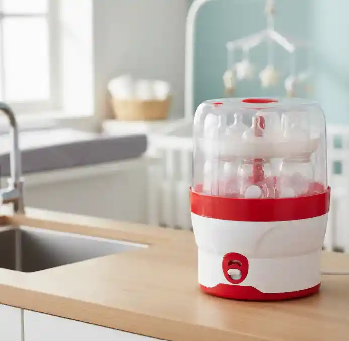 El esterilizador de vapor KIDSHOP es muy útil porque tiene la capacidad de esterilizar 6 teteros y accesorios en sus bandejas. Su acción esterilizadora mata todas las bacterias dañinas en calor intenso en 8 minutos aproximadamente. Tiene la ventaja de adaptarse a biberones de diferentes formas. Cuando termina el ciclo de esterilización se apaga automáticamente. Es libre de BPA. Es fácil de usar y de limpiar. Se caracteriza por su diseño moderno y compacto. Características Mata todas las bacterias dañinas bajo calor intenso en 8 minutos Capacidad para 6 botellas (no incluidos) Adaptable a teteros de diferentes formas Libre de BPA Apagado automático Rápido y fácil de usar Fácil de limpiar Vaso medidor y pinzas ( incluidos)