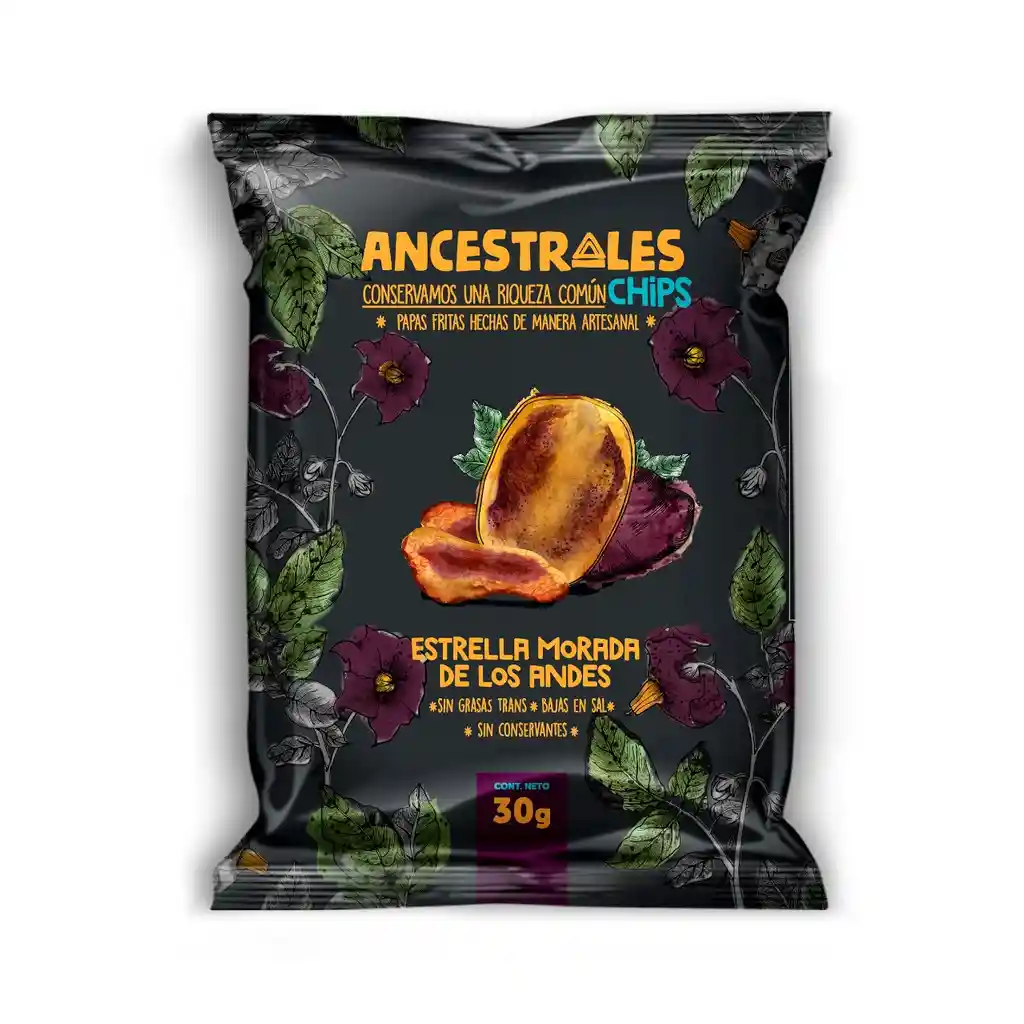 Papas con pigmentación morada en su cáscara Papas elaboradas de manera artesanal, con sal marina y sin conservantes 30 gramos.
