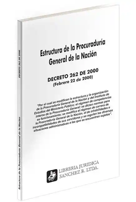 Decreto 262 de 2000 (Febrero 22 del 2000). Por el cual se modifican la estructura y la organización de la Procuraduría General de la Nación y del Instituto de Estudios del Ministerio Público; el régimen de competencias interno de la Procuraduría General; se dictan normas para su funcionamiento; se modifica el régimen de carrera dela Procuraduría General de la Nación, el de inhabilidades e incompatibilidades de sus servidores y se regulan las diversas situaciones administrativas a las que se encuentren sujetos.