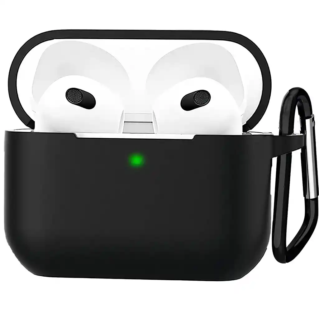 Estuche para Airpods serie 3 de color Negro Material premium: Hecho de silicona elastomérica de alta calidad, evita que la piel se irrite; Resistente al agua, al sudor y a los arañazos y mantiene tu funda Airpods más segura. Incluye llavero: Cada estuche de Airpods está equipada con un llavero de metal, por lo que es conveniente sujetar la bolsa de Airpods a un bolso o mochila Diseño de colores personales: múltiples colores únicos para elegir, para adaptarse a su estado de ánimo y vestirse en diferentes ocasiones, recibirá comentarios y cumplidos cada vez que lo tome. Materiales del interior: Gamuza
