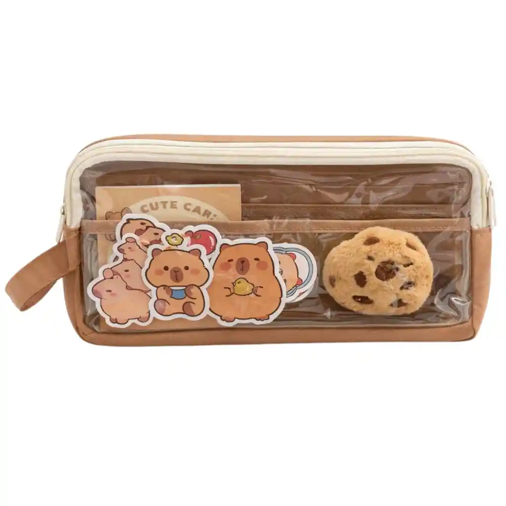 🧸 Set de accesorios temáticos de Capibara – ¡Ternura en cada detalle! Este encantador set incluye una cartuchera transparente con bordes en tono café. Incluye: - 5 Stickers de ositos. - 1 un peluche pequeño suave en forma de capibara con click. - 1 click con carita de osito - 1 click con carita de osito con pescado - 1 llavero con cadena de bolitas amarillas que sostiene una tierna ilustración de un oso y un gato. - 1 cuaderno pequeño para notas Ideal para amantes de la papelería kawaii, coleccionistas o como regalo especial. Cada elemento está cuidadosamente diseñado para transmitir dulzura y personalidad, perfecto para decorar tu escritorio, mochila o rincón favorito.