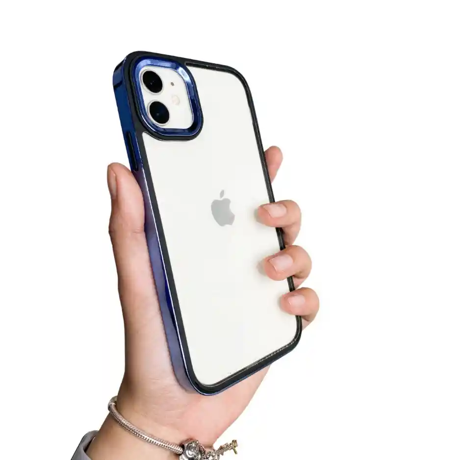 Estuché de iPhone 11 con bordes azul metalizado y parte trasera transparente