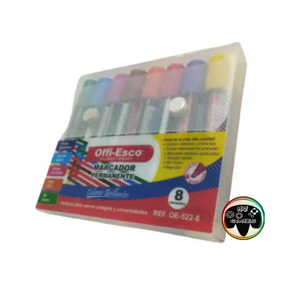 Estuche de Marcadores Permanente (8 unidades) con punta biselada Japonesa Tinta de la más alta calidad Colores intensos y brillantes Marcador artístico graficador Secado rápido No tóxico Bajo olor Utilice en : - Papeles esmaltados - Cartulina - Cerámica - Madera - Vidrio - Metal - Caucho Colores: Rojo - Morado - Azul - Fucsia - Verde - Naranja - Café - Amarillo