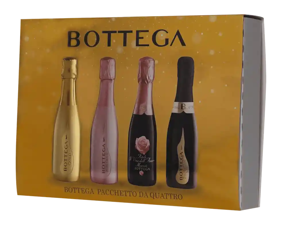 Déjate seducir por la exquisitez del Pacchetto da Quattro , un exclusivo set de Proseccos Bottega diseñado para transformar cualquier ocasión en un momento inolvidable. Este elegante pack incluye cuatro botellas individuales de 200 ml, cada una representando un sabor único y refinado que define el arte de la vinificación italiana.