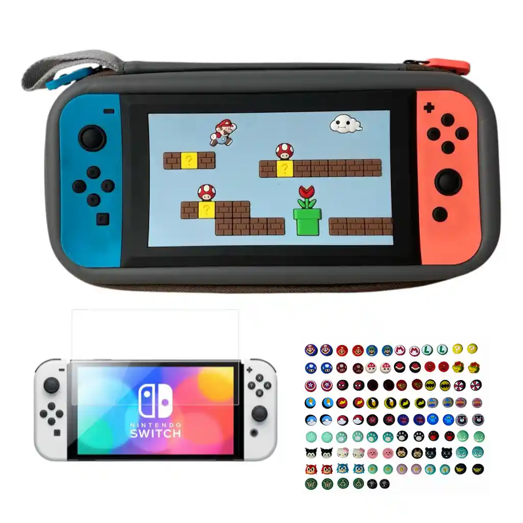 Esta Compra Incluye: - 1 Estuche Edicion Mario Mundo Negro - 1 Vidrio - 2 Grips (1 Par) Compatible Con Switch Oled