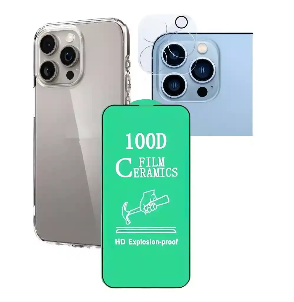 Forro antichoque transparente + protector de pantalla ceramico irrompible + vidrio completo de camara para iphone