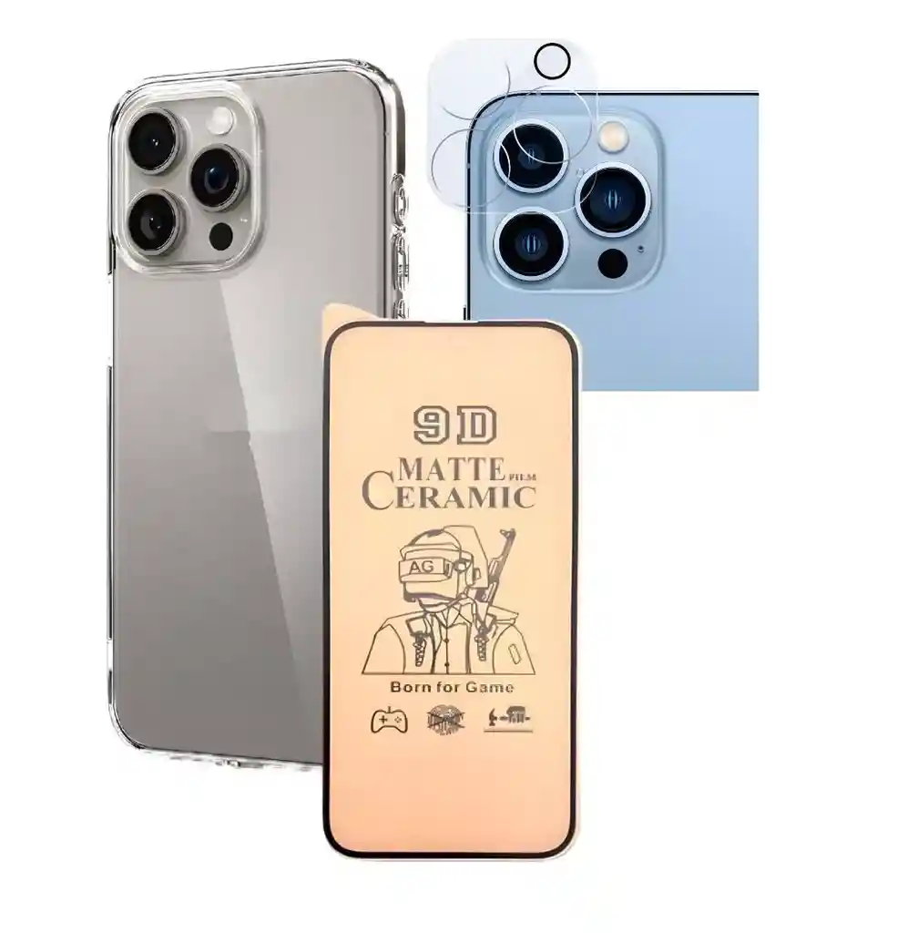 Forro antichoque transparente + protector de pantalla ceramico irrompible + vidrio completo de camara para iphone