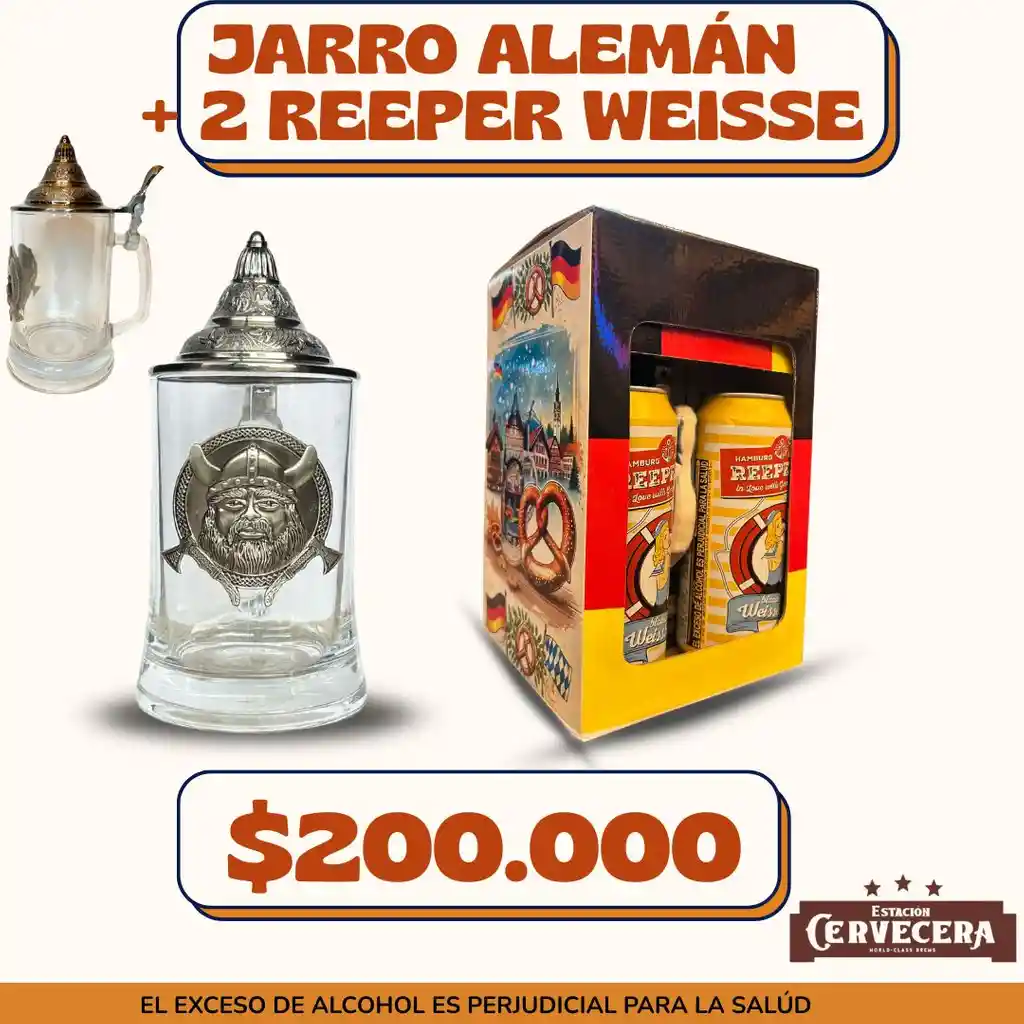 Jarro Cervecero Alemán Tradicional + 2 Reeper weissbier 500ml 5.4% alc Disfruta tu cerveza como en las tabernas bávaras con este jarro de cerámica hecho al estilo tradicional alemán. Decorado con relieves artesanales y tapa de estaño, este tipo de jarro tiene siglos de historia, usado desde el siglo XIV para mantener la cerveza fresca y protegida. Ideal para los amantes de la cerveza y la cultura cervecera europea.