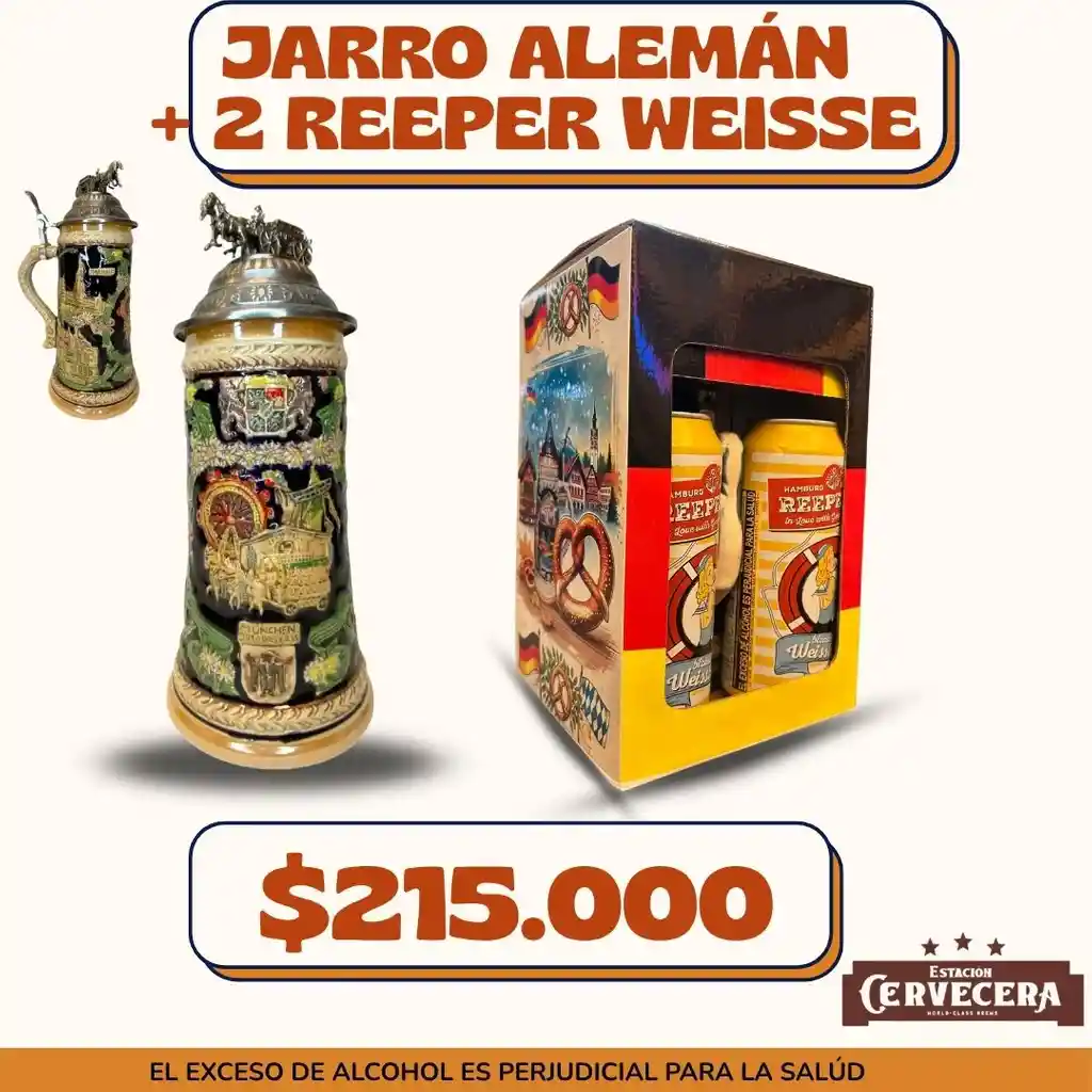 Jarro Cervecero Alemán Tradicional + 2 Reeper weissbier 500ml 5.4% alc Disfruta tu cerveza como en las tabernas bávaras con este jarro de cerámica hecho al estilo tradicional alemán. Decorado con relieves artesanales y tapa de estaño, este tipo de jarro tiene siglos de historia, usado desde el siglo XIV para mantener la cerveza fresca y protegida. Ideal para los amantes de la cerveza y la cultura cervecera europea.