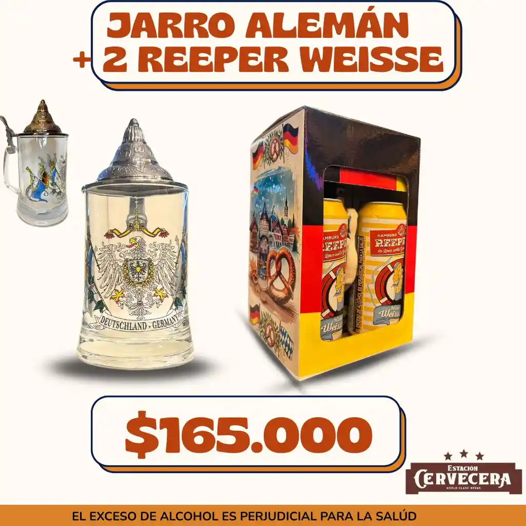 Jarro Cervecero Alemán Tradicional + 2 Reeper weissbier 500ml 5.4% alc Disfruta tu cerveza como en las tabernas bávaras con este jarro de cerámica hecho al estilo tradicional alemán. Decorado con relieves artesanales y tapa de estaño, este tipo de jarro tiene siglos de historia, usado desde el siglo XIV para mantener la cerveza fresca y protegida. Ideal para los amantes de la cerveza y la cultura cervecera europea.