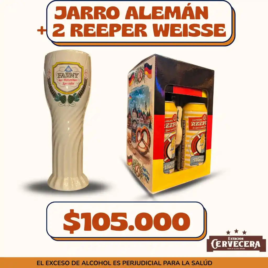 Jarro Cervecero Alemán Tradicional + 2 Reeper weissbier 500ml 5.4% alc Disfruta tu cerveza como en las tabernas bávaras con este jarro de cerámica hecho al estilo tradicional alemán. Decorado con relieves artesanales y tapa de estaño, este tipo de jarro tiene siglos de historia, usado desde el siglo XIV para mantener la cerveza fresca y protegida. Ideal para los amantes de la cerveza y la cultura cervecera europea.