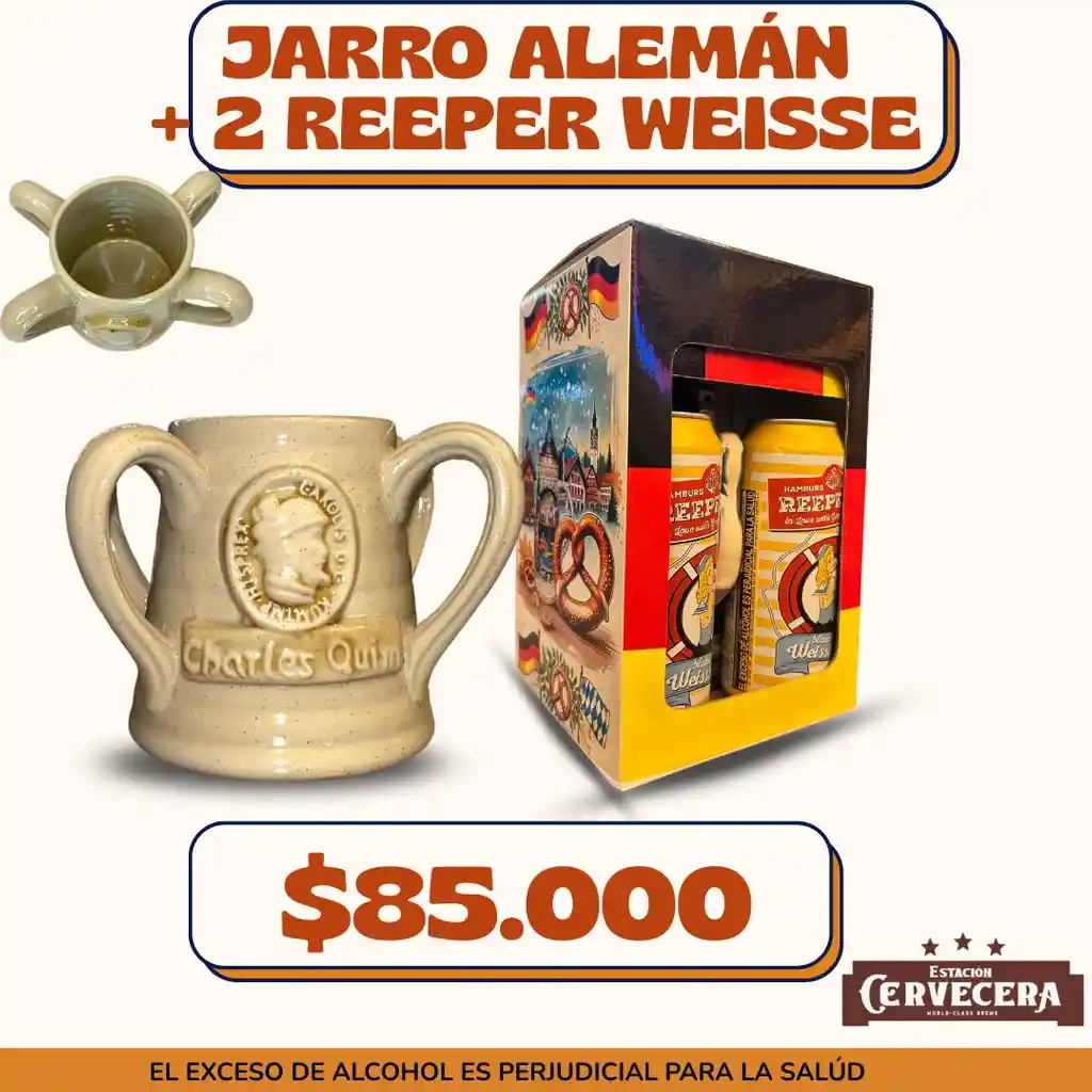 Jarro Cervecero Alemán Tradicional + 2 Reeper weissbier 500ml 5.4% alc Disfruta tu cerveza como en las tabernas bávaras con este jarro de cerámica hecho al estilo tradicional alemán. Decorado con relieves artesanales y tapa de estaño, este tipo de jarro tiene siglos de historia, usado desde el siglo XIV para mantener la cerveza fresca y protegida. Ideal para los amantes de la cerveza y la cultura cervecera europea.