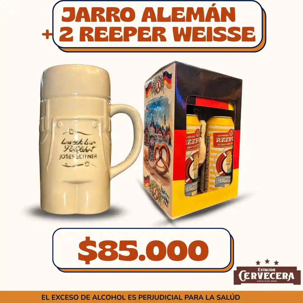 Jarro Cervecero Alemán Tradicional + 2 Reeper weissbier 500ml 5.4% alc Disfruta tu cerveza como en las tabernas bávaras con este jarro de cerámica hecho al estilo tradicional alemán. Decorado con relieves artesanales y tapa de estaño, este tipo de jarro tiene siglos de historia, usado desde el siglo XIV para mantener la cerveza fresca y protegida. Ideal para los amantes de la cerveza y la cultura cervecera europea.