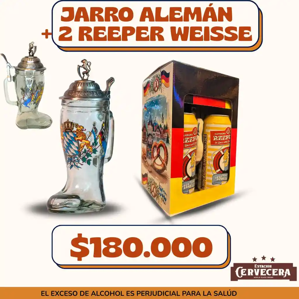 Jarro Cervecero Alemán Tradicional + 2 Reeper weissbier 500ml 5.4% alc Disfruta tu cerveza como en las tabernas bávaras con este jarro de cerámica hecho al estilo tradicional alemán. Decorado con relieves artesanales y tapa de estaño, este tipo de jarro tiene siglos de historia, usado desde el siglo XIV para mantener la cerveza fresca y protegida. Ideal para los amantes de la cerveza y la cultura cervecera europea.
