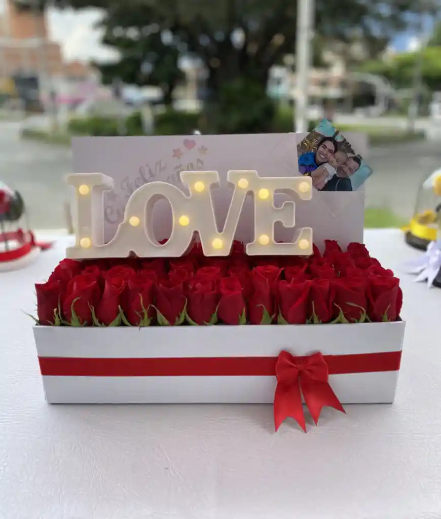 estuche rectangular con 50 rosas a color de tu preferencia acompañado de letras y chocolates