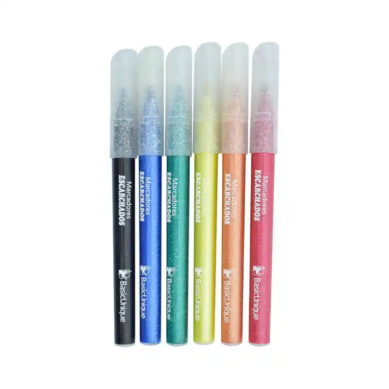 Marcador escarchado, trazo suave y brillante, ideal para decorar tus apuntes o marcar tus cuadernos. Caja por 6 unidades, colores distintos.